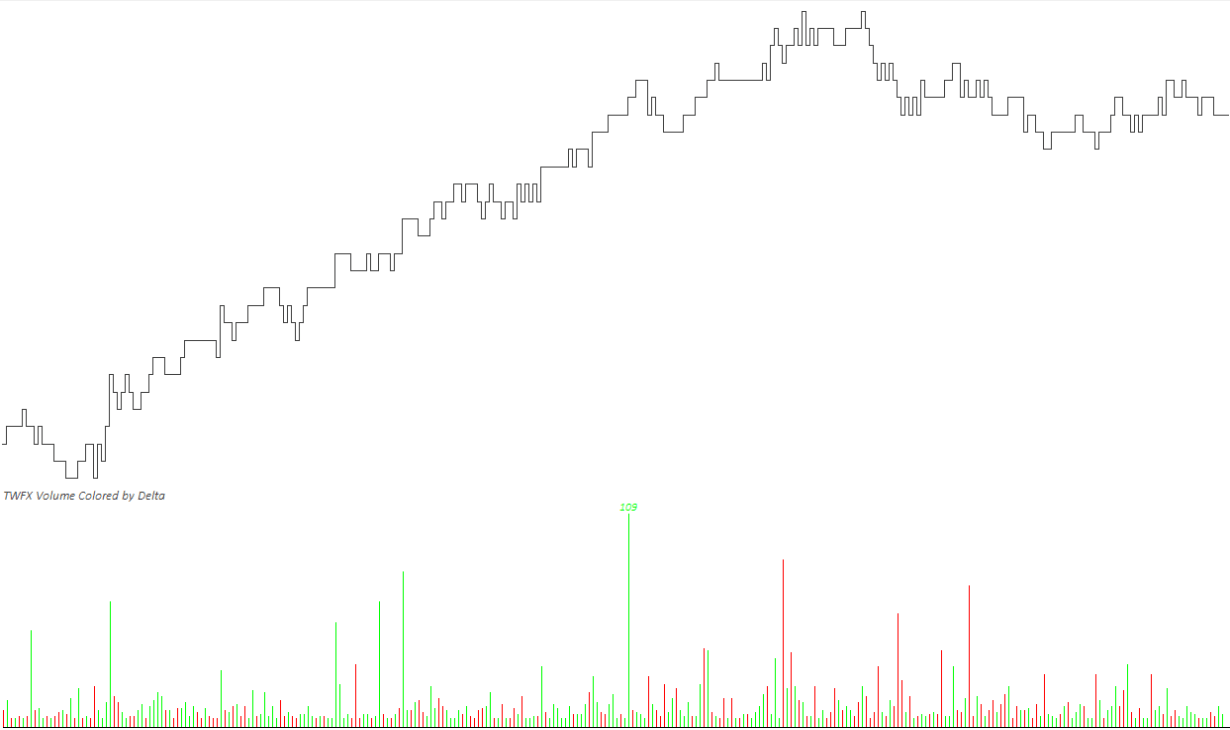 The Volume Colored by Delta study displays traded volume as a histogram with numeric labelling, colored according to the dominant side (ask or bid) volume.